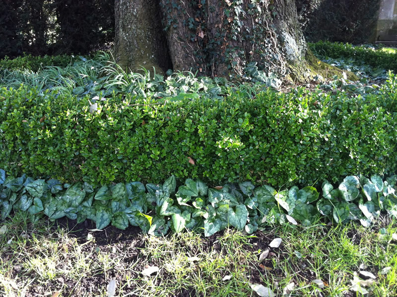 One beautiful idea we saw there was a circular box hedge around a tree, underplanted with cyclamen. We’re definitely going to borrow that idea, though sadly we can’t quite borrow some of the other beautiful things we saw there in our own space – a potager with brick paths mixing flowers for the house with vegetables and salads for the kitchen, the field of vegetable borders with early rhubarb, rows of spring salads such as American land cress (very peppery when we stole a quick taste) and you really do need the space for the poly tunnels that supply the kitchen in volume.